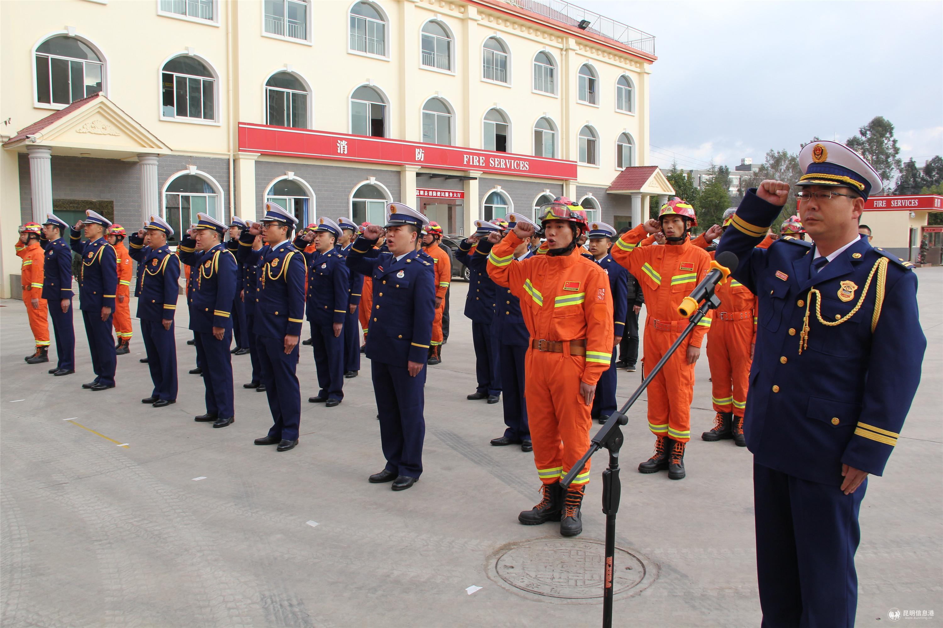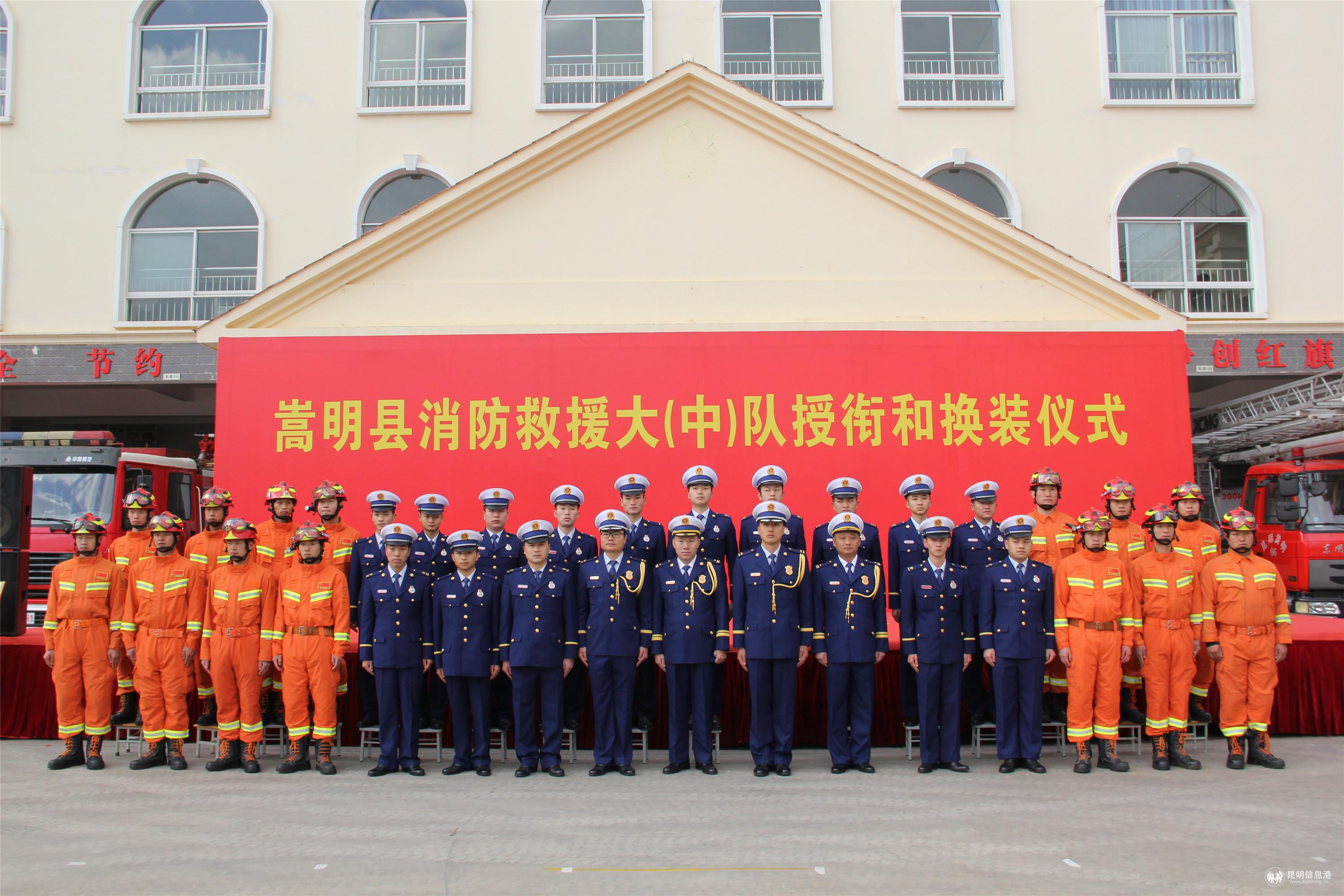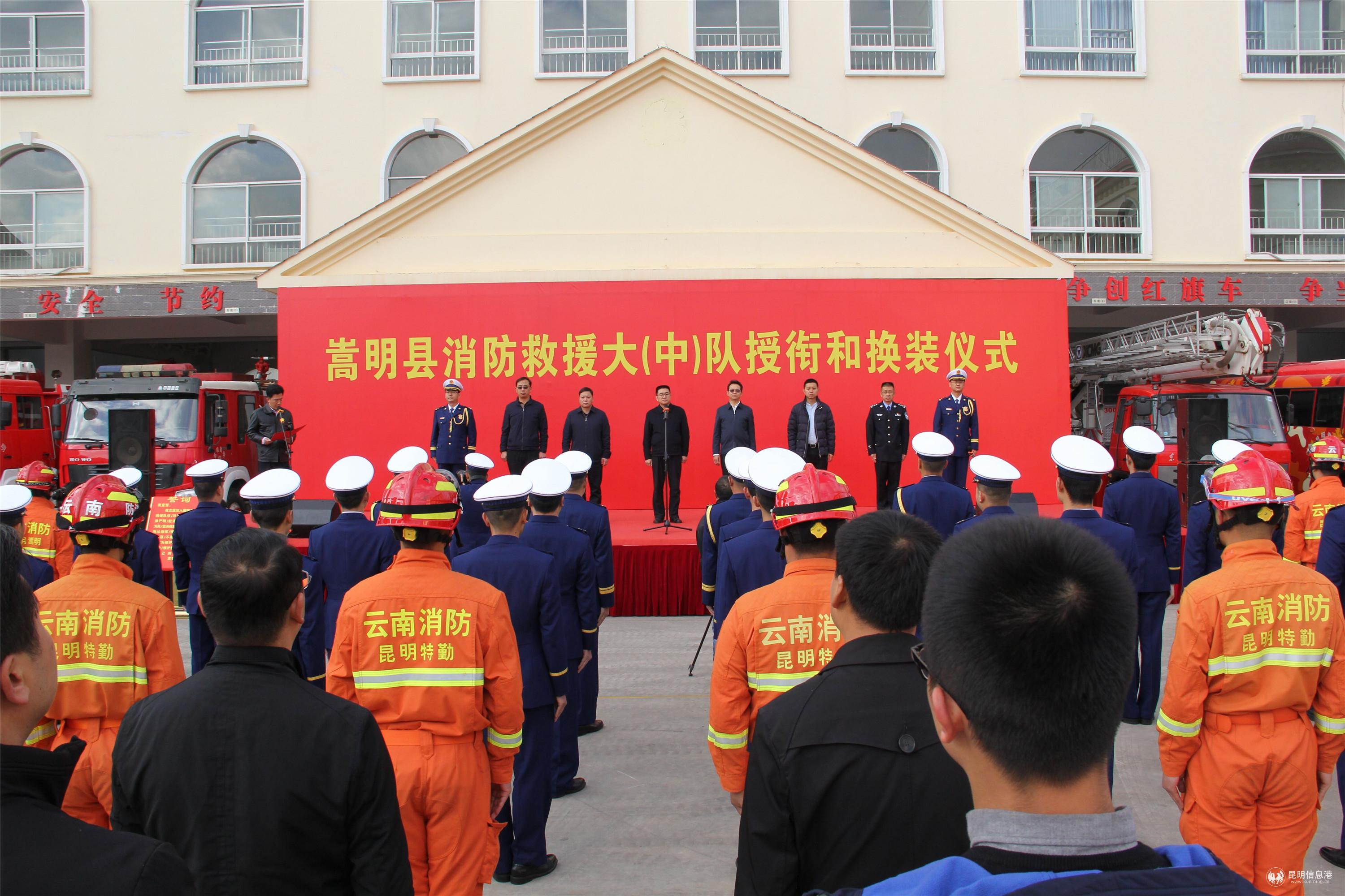 昆明信息港讯 1月3日,嵩明县消防救援大队举行授衔和换装仪式。县领导杨相来、王秀江、潘加智、李友华、龙江、苏志云、李韬及相关单位负责人,县消防大队全体消防救援人员参加仪式。
