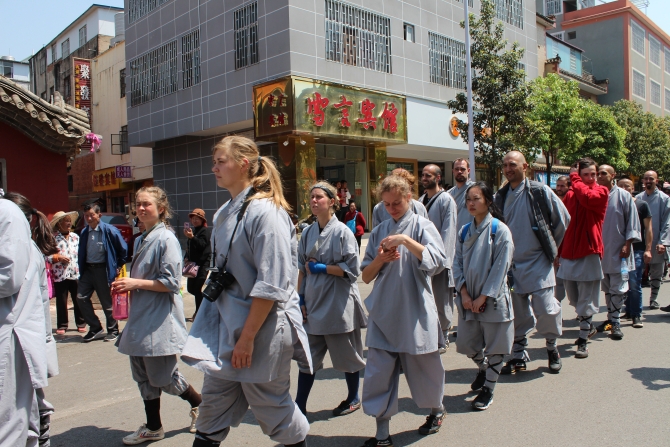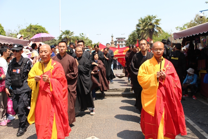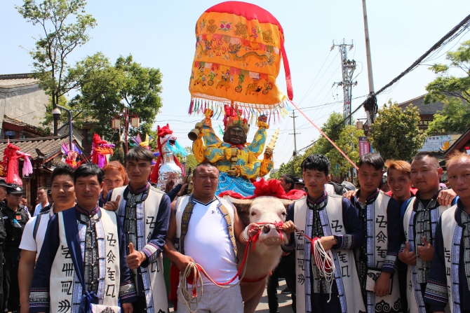 下午13时许,伴随着喜庆的音乐,土主庙会最主要的环节“白牛迎土主”大巡游活动正式开始。巡游队伍人员个个身着节日盛装,专人将土主像抬捧在选定的白毛水牛背上,大家簇拥着雄壮的白毛水牛,仪仗队抬着“銮驾”,在佛像前鸣锣开道,善男信女跟在“銮驾”后,手执法器,诵念经文,乐师、狮舞、龙灯、水族、灯戏、武术等队伍也紧跟其后,开始围着官渡古镇巡游,队伍中手舞足蹈的信徒们,用喜庆热闹的形式来祈求五谷丰登、风调雨顺、国泰民安。