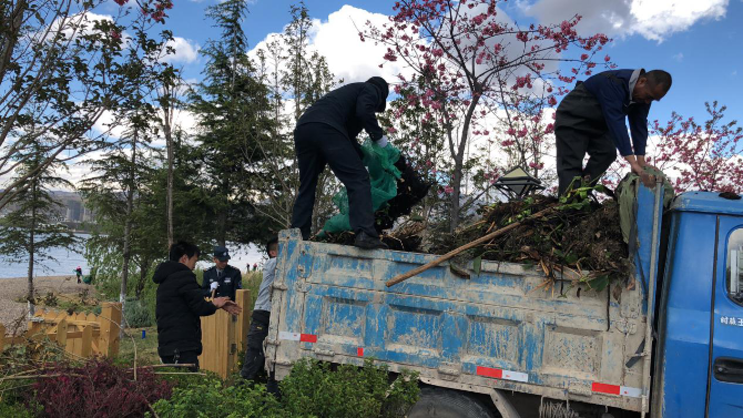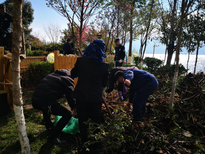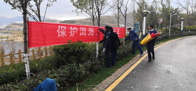 每日在临海安排10位工作人员,组成垃圾打捞小组,对沿岸漂浮的生活垃圾、水草进行打捞;在物业项目显著位置悬挂保护洱海相关宣传标语;3月21日—23日,开展三天集中打捞活动,48人共计打捞生活垃圾、建筑垃圾、绿化垃圾以及水葫芦等20车,共计41吨。