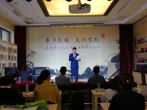 2019年3月16日,昆明市工人文化宫“书声昆明 文化宫殿”读书朗诵比赛周赛第一期如期在昆明市工人文化宫读书朗诵会馆举行。下午13:00点,选手们开始抽签,前来观看比赛的朗读爱好者也纷纷签到入座。平时让大家安静看书的读书朗诵会馆一下子热闹非凡。担任本次比赛评委的是云南广播电视台新闻中心《云南新闻联播》主播、云南省朗诵学会常任理事、昆明理工大学艺术传媒学院兼职副教授刘刚、云南广播电视台主任播音员、云南艺术学院播音系客座教授王旭东。本次比赛共有10名选手参加,他们来自不同职业,处在不同年龄,但都因为热爱读书朗诵走上读书朗诵会馆的舞台,他们用自己的朗诵传递着相同的劳动精神。他们用自己的平凡,为社会创造着财富和幸福。