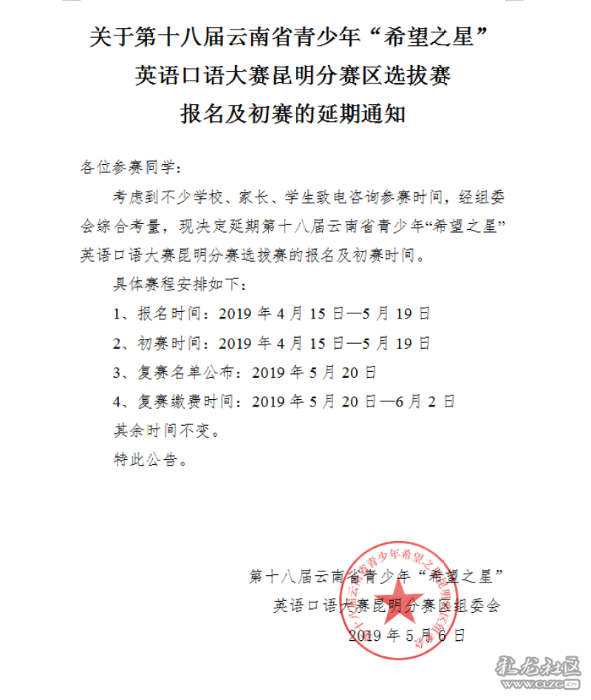 “希望之星”英语口语大赛 报名及初赛的延期通知