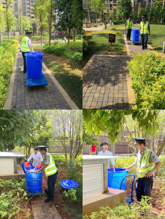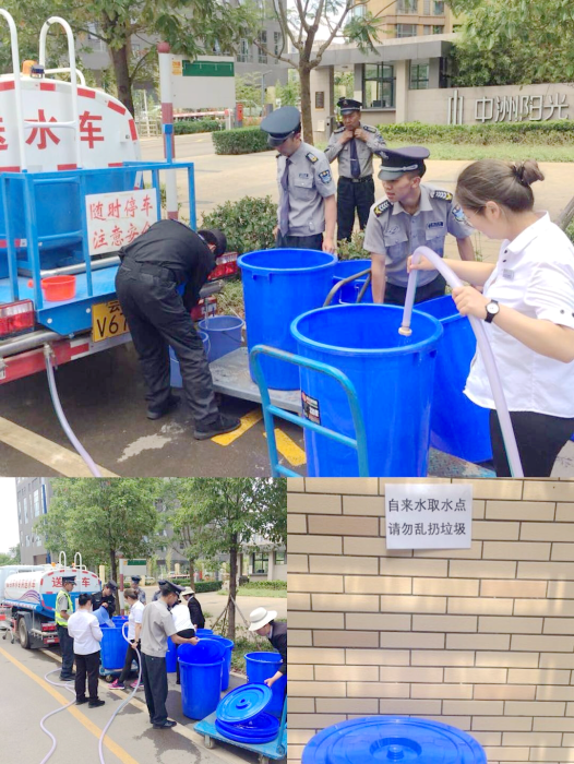 第二天一早,客服人员拨打自来水公司电话,落实报修进度并要求调派送水车辆为小区住户供水,同时客服人员及秩序队员针对不方便取水的业主提供送水上门服务。因未收到恢复供水通知,并考虑到业主夜间用水,中心经理带领保洁、秩序、客服人员准备蓄水桶摆放至每栋单元门内方便业主取水使用。