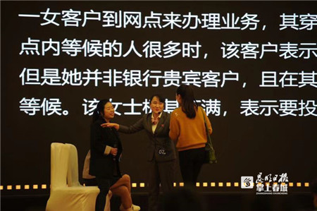 昆明信息港讯 客户身份证照片与本人差距太大怎么办?遇到狂飙外语不会中文的外国人前来办卡怎么办?银行网点突然停电,客户在大堂内争吵怎么办?11月9日,2019昆滇银行服务观察暨职业技能大赛在滇池路怡景园度假酒店举行。来自14家银行的42位专业的大堂经理通过临场应对各种突发情况,凭自己良好的应变能力和专业的业务素质角逐“大堂金牌经理”席位。