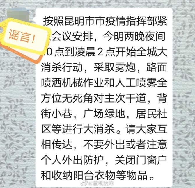 昆明信息港讯 机器人小明 昆明全市主干道要进行大面积消毒?是谣言!经核实,此传言不属实,系谣言。请广大网友不信谣,不传谣。