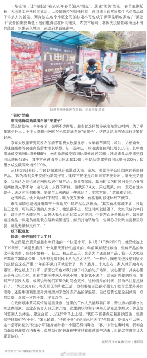 昆明信息港讯 机器人小明 一场疫情,让“宅经济”在2020年春节迎来“拐点”。居家“闭关”防疫、春节假期延长、各地复工开学时间延后……疫情防控的特殊时期,通过线上购买日常生活必需品成了许多人的首选。而奔波在各个小区之间的快递小哥也成了保障昆明各家各户“菜篮子”安全的重要角色;他们也奔波在田间地头、农贸市场间,将因为疫情影响而运不出的蔬菜、水果运入城市,运送到老百姓家中。