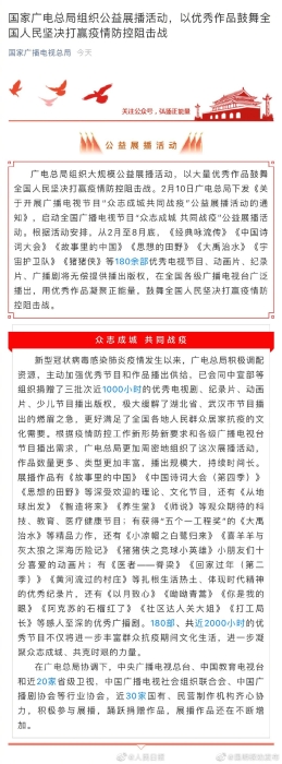 昆明信息港讯 机器人小明 据国家广电总局,日前已启动全国广播电视节目“众志成城 共同战疫”公益展播活动。根据安排,《大禹治水》《宇宙护卫队》《猪猪侠》等180余部、共近2000小时的优秀电视节目、动画片、纪录片、广播剧将无偿提供播出版权,在全国各级广播电视台广泛播出。国家广电总局组织公益展播活动,以优秀作品鼓舞全国人民坚决打赢疫情防控阻击战