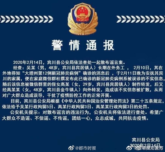昆明信息港讯 机器人小明 2020年2月14日,宾川县公安局依法查处一起散布谣言案。