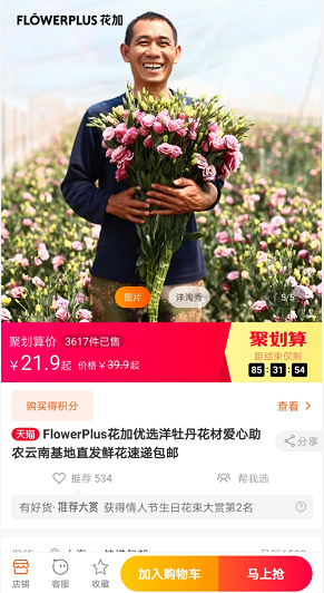 目前,经过审核,第一批参与“助力花农、抗击疫情、恢复生产”线上销售的天猫平台电商分别是花艺生活(北京)电子商务有限公司的花点时间旗舰店、上海分尚网络科技有限公司的flower plus旗舰店、昆明花似梦花卉园艺有限公司的欣华隆旗舰店、以及昆明绚丽花卉有限公司的果力贝旗舰店。