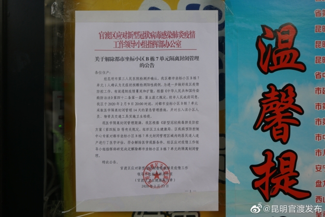2月23日,太和街道佴家湾社区辖区内都市坐标小区B栋7单元隔离封闭管理15天期限届满,官渡区应对新型冠状病毒感染的肺炎疫情工作领导小组指挥部和太和街道按程序对该区域解除隔离封闭管理措施。