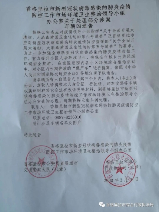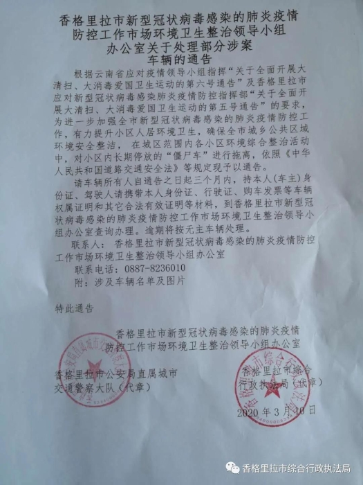 根据云南省应对疫情领导小组指挥“关于全面开展大清扫、大消毒爱国卫生运动的第六号通告”及香格里拉市应对新型冠状病毒感染肺炎疫情防控指挥部“关于全面开展大清扫、大消毒爱国卫生运动的第五号通告”的要求,为进一步加强全市新型冠状病毒感染的肺炎疫情防控工作,有力提升小区人居环境卫生,确保全市城乡公共区域环境安全整洁,在城区范围内各小区环境综合整治活动中,对小区内长期停放的“僵尸车”进行拖离,依照《中华人民共和国道路交通安全法》等规定现予以通告。