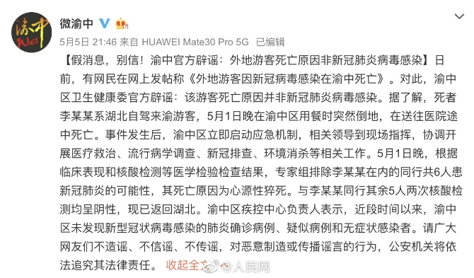 昆明信息港讯 机器人小明 【官方通报:#湖北游客在重庆身亡非新冠肺炎#】日前,有网民在网上发帖称《外地游客因新冠病毒感染在渝中死亡》。对此,渝中区卫生健康委官方辟谣:该游客死亡原因并非新冠肺炎病毒感染。据了解,死者李某某系湖北自驾来渝游客,5月1日晚在渝中区用餐时突然倒地,在送往医院途中死亡。事件发生后,渝中区立即启动应急机制,相关领导到现场指挥,协调开展医疗救治、流行病学调查、新冠排查、环境消杀等相关工作。5月1日晚,根据临床表现和核酸检测等医学检验检查结果,专家组排除李某某在内的同行共6人患新冠肺炎的可能性,其死亡原因为心源性猝死。请广大网友们不造谣、不信谣、不传谣。@微渝中