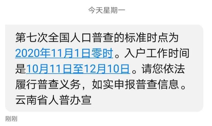 10月11日至10月31日期间,云南省全面开展第七次全国人口普查摸底工作。为切实做好云南省第七次全国人口普查社会动员和宣传工作,引导每一个公民积极支持、配合人口普查,云南省人普办、省委宣传部联合省通信管理局聚力云南移动、云南电信和云南联通,对全省五千多万手机用户发送了人口普查公益宣传短信,全面提升普查知晓率,为普查工作顺利实施创造良好的舆论氛围。
