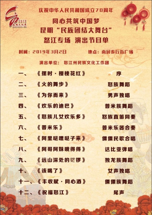 为深入学习贯彻党的十九大精神,进一步贯彻落实习近平总书记对云南工作的重要指示精神,大力培育和弘扬社会主义核心价值观,深入开展民族团结,不断提升昆明市现代公共文化服务效能,结合昆明市创建全国民族团结进步示范市和创建第四批国家公共文化服务体系示范区工作实际, 2019年我市将继续深入开展“春城文化节”系列活动,并在“春城文化节”中推出昆明“民族团结大舞台”文艺精品及非物质文化遗产展演展示活动,以文化为凝聚力,团结全市各民族上下一心,共同唱响主旋律,弘扬社会主义核心价值观,高质量推进区域性国际中心城市建设,以优异成绩庆祝中华人民共和国成立70周年。继2019年1月圆满完成昆明“民族团结大舞台”文艺精品及非物质文化遗产展演展示(曲靖专场)活动之后,我市将于2019年3月2日举办昆明“民族团结大舞台”文艺精品及非物质文化遗产展演展示(怒江专场),通过怒江民族文艺精品展演和非遗特色展示,宣传怒江的地域文化、民族文化和旅游文化,促进昆明、怒江两地文化、经济的交流与发展,展现云南各民族团结奋斗、共同繁荣的景象。
