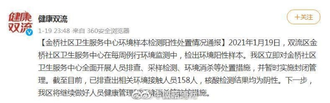 1月19日,成都双流区金桥社区卫生服务中心在每周例行环境监测中,检出环境阳性样本。双流区立即对金桥社区卫生服务中心全面开展人员排查、采样检测、环境消杀等处置措施,并暂时实施封闭管理。截至目前,已排查出相关环境接触人员158人,核酸检测结果均为阴性。