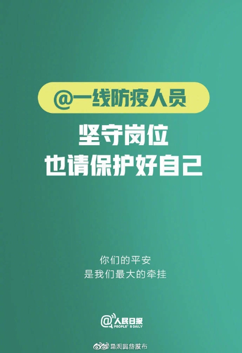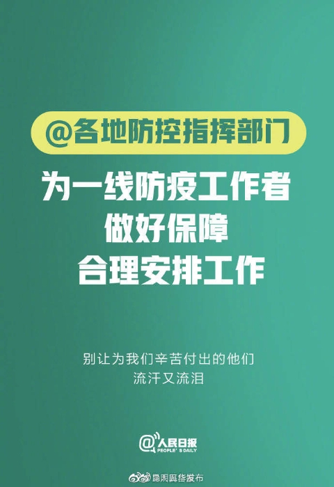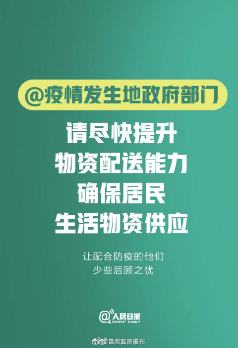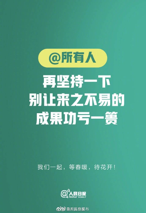 当前,疫情防控正处于关键时期,相关部门再周全些,确保生活物资供应;大家再坚持一下,做好防护,别让来之不易的成果功亏一篑…#疫情防控关键阶段9个倡议#↓↓每个为抗疫付出的你都了不起!挺过这个非常时期,我们一定会迎来春暖花开、“疫霾”散尽的时刻! (@人民日报)