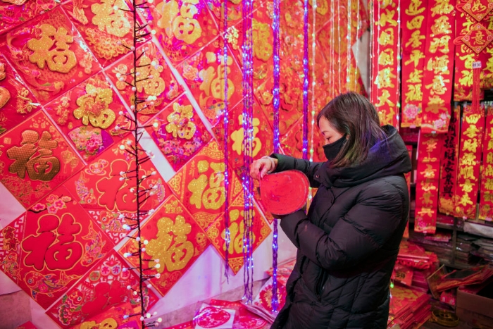 在北京,各大商超的入口被红火的节庆商品装点一新。记者来到物美超市双井店,看到这里的年货饰品区挂满红对联、中国结、红灯笼等,水果区的草莓、猕猴桃等进口水果种类丰富,洋溢着新春气氛。