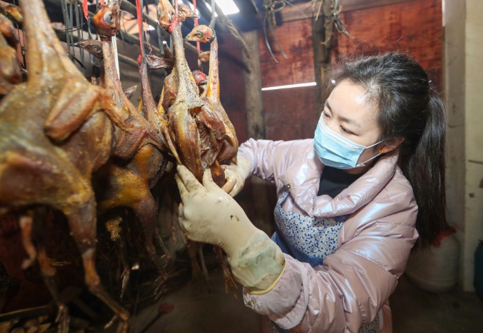 1月23日,在贵州省玉屏侗族自治县田坪镇彰寨村的一家山鸡腊制品作坊,工作人员查看腊山鸡熏制情况。春节将至,作坊抓紧生产,供应年货市场。新华社发(胡攀学摄)