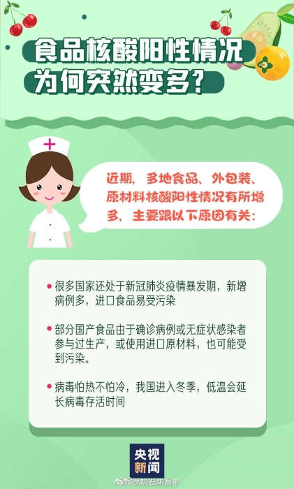 近日,多地的进口车厘子、鸡翅、啤酒等食品饮料的外包装或内表面检出核酸阳性。食品核酸阳性情况为何突然变多?各类食品是否还能放心吃?如果购买的食品与阳性样本有关该如何处理?看图了解↓↓ (@央视新闻)