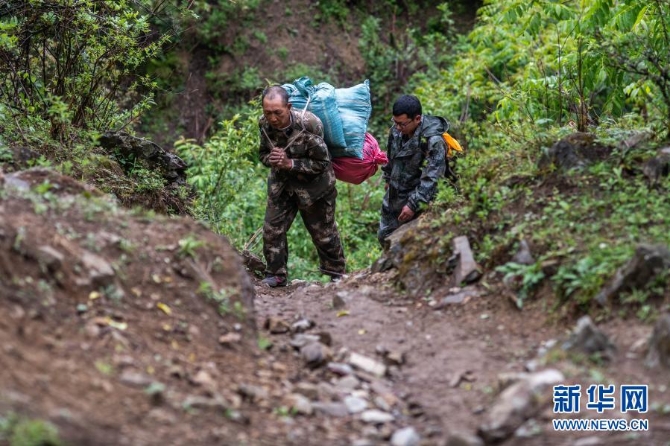 在云南省迪庆藏族自治州香格里拉滇金丝猴国家公园,护猴员余小德(左)背着喂滇金丝猴的食物上山(2020年5月23日摄)。新华社 记者胡超/摄