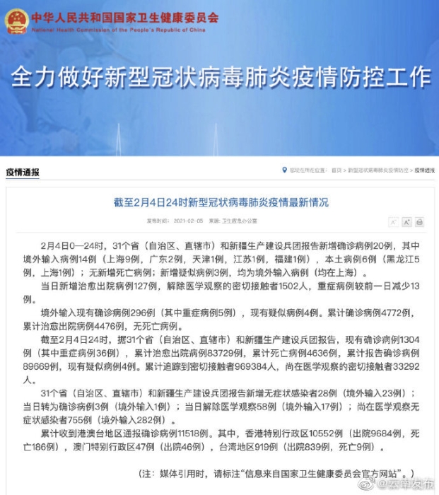 2月4日0—24时,31个省(自治区、直辖市)和新疆生产建设兵团报告新增确诊病例20例,其中境外输入病例14例(上海9例,广东2例,天津1例,江苏1例,福建1例),本土病例6例(黑龙江5例,上海1例);无新增死亡病例;新增疑似病例3例,均为境外输入病例(均在上海)。