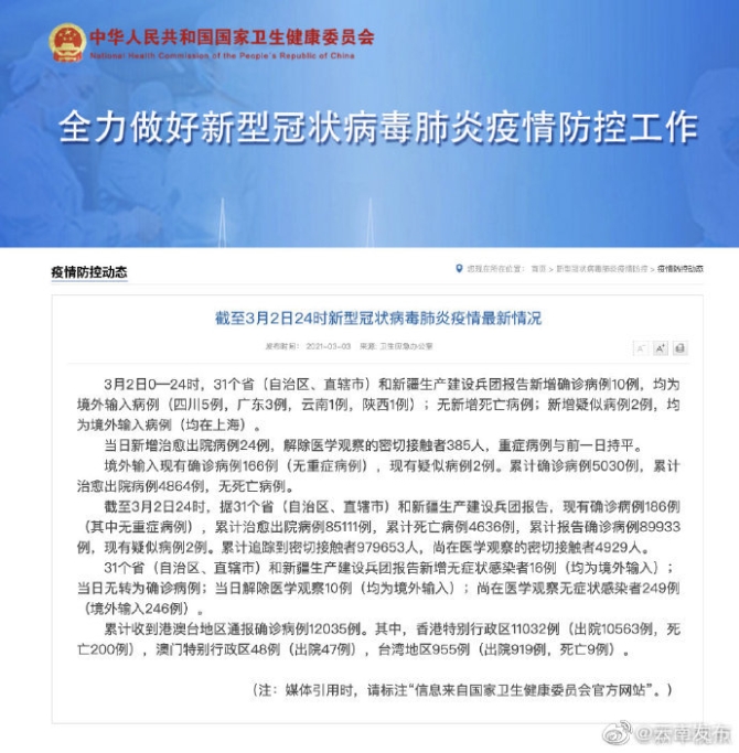 3月2日0—24时,31个省(自治区、直辖市)和新疆生产建设兵团报告新增确诊病例10例,均为境外输入病例(四川5例,广东3例,云南1例,陕西1例);无新增死亡病例;新增疑似病例2例,均为境外输入病例(均在上海)。