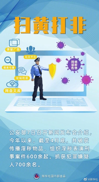 据公安部7日新闻发布会,截至4月底,全国共破获传播淫秽物品、组织淫秽表演刑事案件600余起,抓获犯罪嫌疑人700余名。各地公安机关以网络淫秽色情问题为打击重点,围绕网络社交平台、论坛社区、搜索引擎、弹窗广告、网盘文库等主要传播渠道,以及短视频、网络直播、网络文学、网络游戏等主要传播领域,依法严厉打击整治网络淫秽色情违法犯罪活动,特别是对传播儿童色情信息、引诱强迫未成年人色情直播等违法犯罪活动。公安机关将对制作传播淫秽物品犯罪活动,始终保持高压严打态势,突出未成年人保护,坚决扫除各类“文化垃圾”。(新华社 记者任沁沁 熊丰)