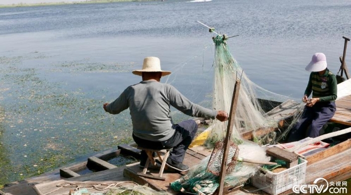 全村总人口2383人,户数815户,耕地面积370亩,苇田面积2187亩,淀泊水面面积1898亩,村庄占地面积343亩。村主导产业为苇编、渔业、旅游、外出务工等。图为渔民夫妇正在整理渔网。