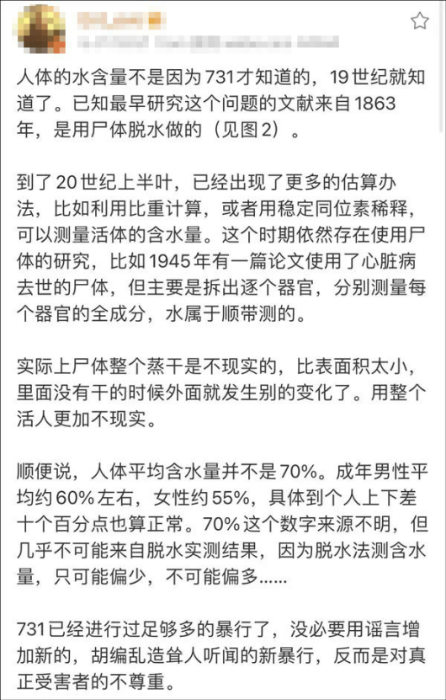 此次日军731部队暴行再被提及,源于5月31日的一则“人体70%是水是日军731部队人体实验室把活的中国人蒸干得出的结论”的帖文。当天,拥有400多万粉丝的某微博科普大V就此发文“辟谣”称:“把尸体蒸干测量含水量不现实”“没必要用谣言为731部队增加新的暴行”。