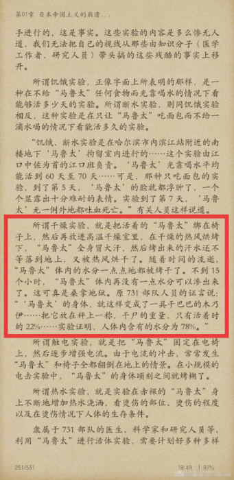 据该书记载,该实验名为“干燥实验”,是将活人绑在椅子上,然后再放进高温干燥室里,不到15小时,变成一具干巴巴的木乃伊……把它放在秤上一称,干尸的重量,只有活着时的22%……实验证明,人体内含有的水分为78%。