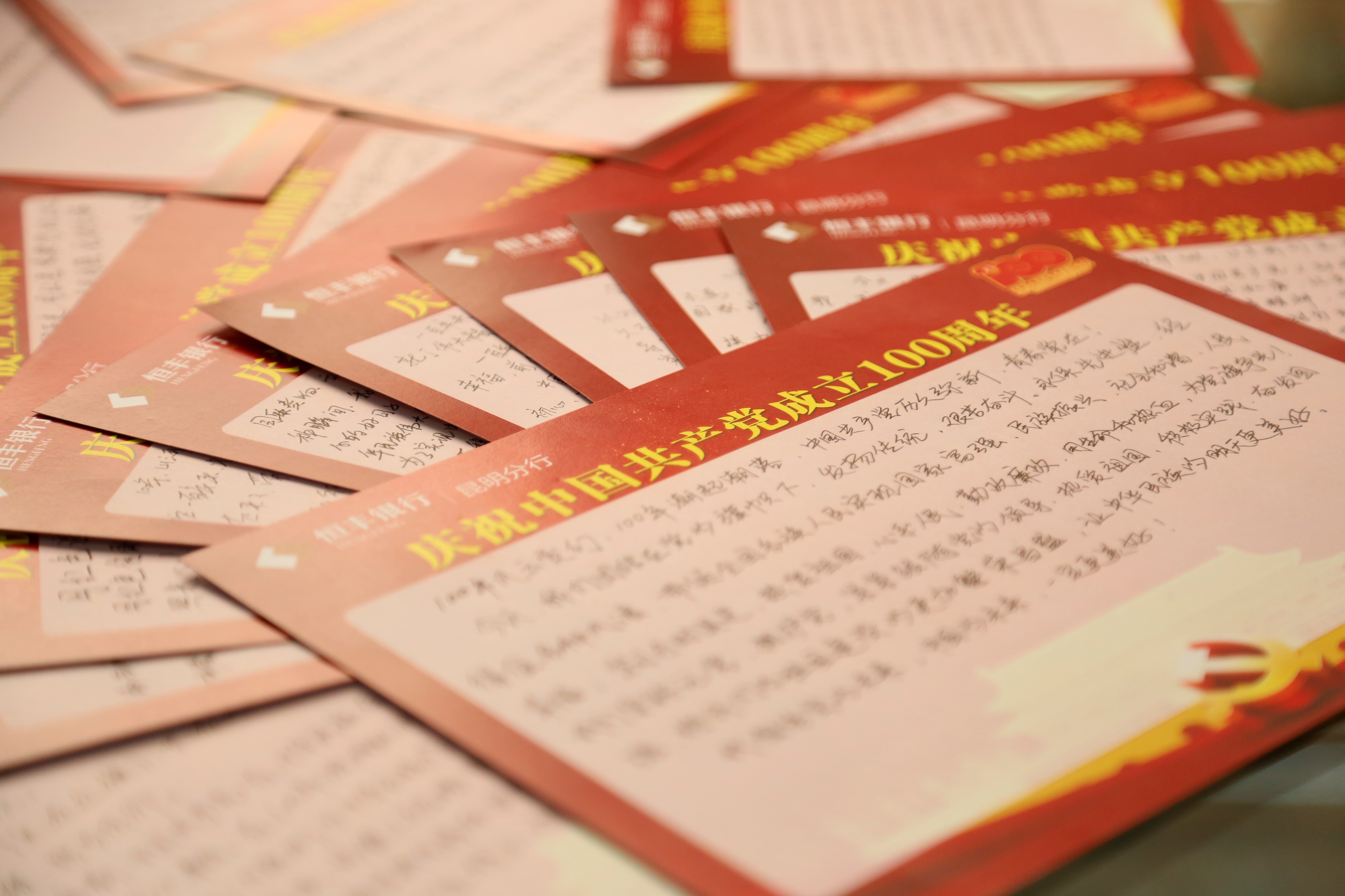 为营造浓厚的活动氛围,分行组织开展“我心向党,说句心里话”祝党生日快乐活动,并专门制作了祝福留言板。在聆听总书记重要讲话之后,全体党员干部心潮澎湃,大家谈感想、话祝福,执笔在祝福留言板上写下对中国共产党的表白祝福,一张张祝福留言板上,写满了或长或短的语句: “听党指挥,永远跟党走”“我为中国共产党骄傲,我为党员身份而自豪”“伟大的中国共产党,我永远追随您、拥护您”、“何其有幸,生于华夏”“看一百年、炎黄争先,看一百年,使命在肩”“初心不忘、勇担使命”“听党话、感党恩、跟党走”……话语间有对中国共产党的热爱之情,有对建党一百周年的美好祝愿,也有对自身的鞭策鼓舞。句句留言情感充沛、诚挚深刻,一张张祝福留言板上满载着每个人的真切心声。