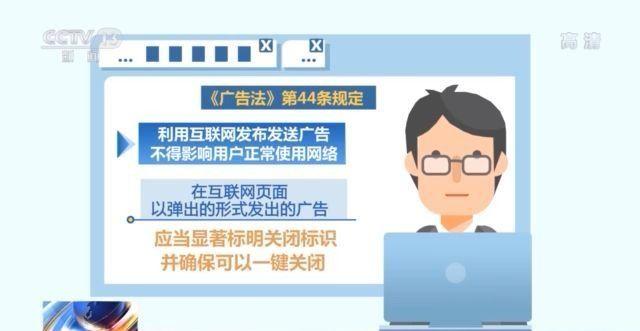其中《广告法》第44条就规定,利用互联网发布发送广告,不得影响用户正常使用网络,在互联网页面以弹出的形式发出的广告,应当显著标明关闭标识,并确保可以一键关闭。