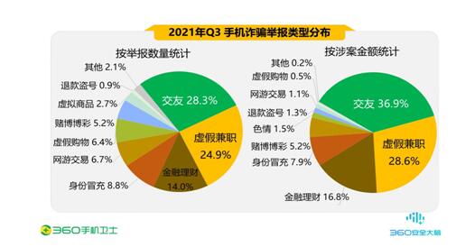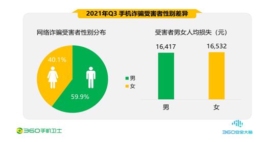 11月16日,中国手机安全状况三季报新鲜出炉,该报告结合最新攻防手段与多维度数据,由三六零(股票代码:601360.SH,以下简称“360”)手机卫士发布。报告显示,2021年第三季度,360手机卫士接到有效诈骗申请329起,涉案总金额541.6万元,人均损失达16463元。其中,男性受害者占比59.9%,比女性受害者高出近2成,但从金额损失来看,男性人均损失16417元,略低于女性115元。诈骗产业化、组织化日趋明显,诈骗技术不断迭代提升,给数字化安全带来严峻挑战。