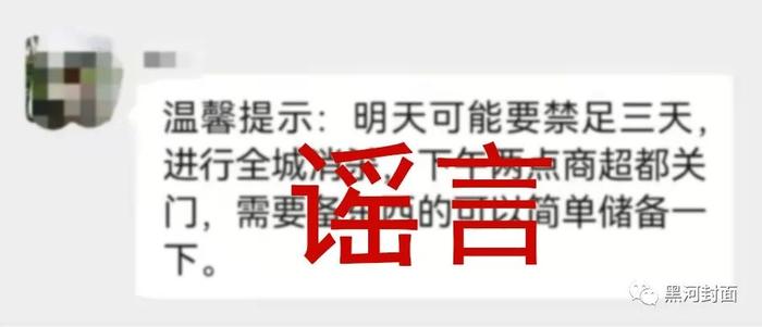 2月27日,在黑河市本地微信群中传播一条信息,称“明天可能要禁足三天,进行全城消杀,下午两点商超都关门,需要备东西的可以简单储备一下。”经核实,该信息为谣言。