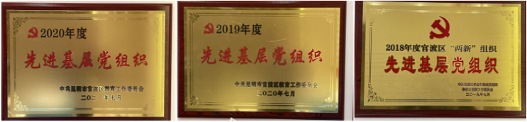 2019年被中共官渡区教育工作委员会评为“2018年度先进党组织”; 2019年被中共官渡区非公有制经济组织和社会组织工作委员会评为“2018年度官渡区两新组织先进基层党组织”;2020年被中共官渡区教育工作委员会评为“2019年度先进党组织”;2021年被中共官渡区教育工作委员会评为“2020年度先进党组织”;2022年被中共官渡区教育工作委员会评为“2021年度先进党组织”;2021年被昆明市“两新”组织评为“党建强、发展强”示范党组织;2021年被昆明市民办教育协会推荐评选为昆明市优秀民办学校。