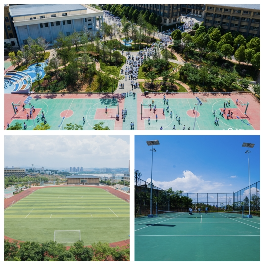 云大附中呈贡校区占地面积214.3亩,校园绿化面积57000余平方米。校园内绿树成荫,芳草萋萋,花香四季,果实累累。学校教学硬件条件在全市乃至全省领先,配有高标准的教学楼、综合楼、实验楼、音乐教室、美术教室、舞蹈教室、地理教室、通用教室等各类功能教室。学生教室配套设施按照“一级一等”完中标准配置,均为现代化多媒体教室,均配置交互式智能黑板、高清实物展台、教学监控及广播等设备;各类功能教室、实验室配备先进设备和器材,内部设施一应俱全;多功能厅大气先进,其内可组织千人活动;图书馆功能布局齐全,藏书总量达9万册;学校建有400米8道标准塑胶跑道、足球场、篮球、排球、羽毛球、网球等场地,建有3300平方米的室内体育馆,供体育教学、体育训练、社团活动、休闲健身等使用,室内体育馆内配有先进的灯光、音响、LED屏,为举办大型活动、开展社团课程提供便利条件,学校的基础设施建设能充分满足教育教学、学生个性成长的需要。