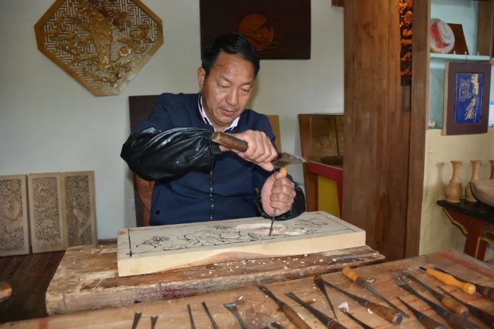 他,从事木雕行业已经整整38年,但依然对木雕保持着热情。虽然现在有了自己的公司和团队,但他还是会经常拿起雕刻工具进行创作。他就是丽江市雕刻艺术协会会长、市级非物质文化遗产传承人赵振金,一名土生土长的纳西族木雕手艺人。