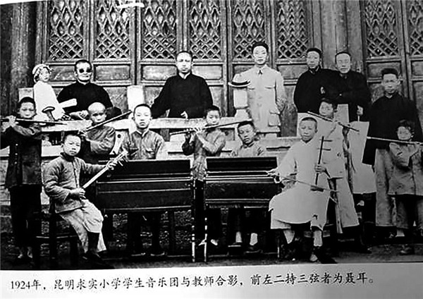 1924年,昆明求实小学学生音乐团与教师合影,前左2持三弦者为聂耳。