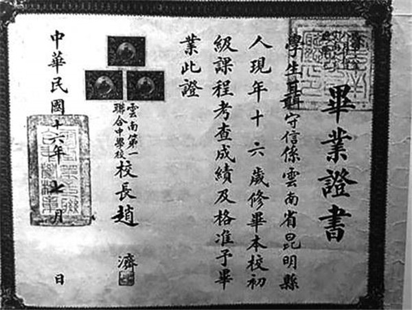 云南省立第一联合中学毕业证书