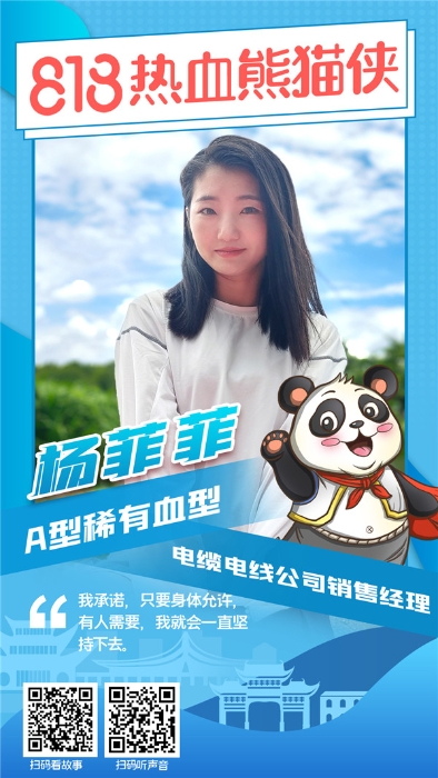 1990年出生的杨菲菲长着一张娃娃脸,笑起来的样子十分亲切,在朋友眼中,她是乐于助人的“热心肠”。2017年,她在怀二胎时得知了自己是稀有血型。“知道自己是‘熊猫血’时第一反应其实是后怕,担心孩子出生后患溶血性贫血,所以后来有人急需用血时,我更能与患者和家属他们感同身受,尽量第一时间赶到。”杨菲菲告诉记者,哺乳期结束后她马上参与了献血,第一次收到自己的血液帮助到他人的短信,她是发自内心的快乐和满足。原来,做点力所能及的事情,就可以帮到他人。