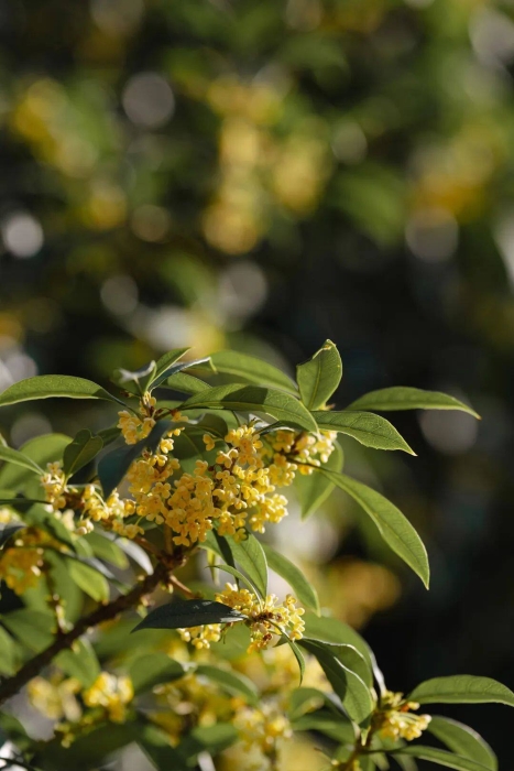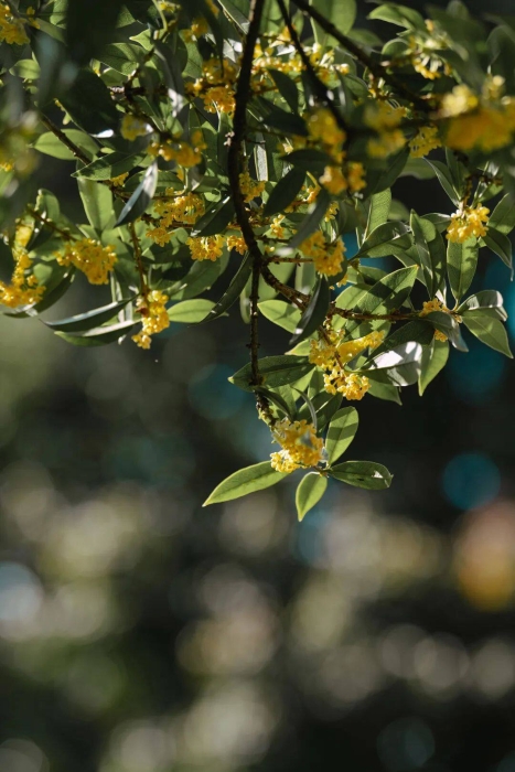 桂花,并无十分姿色,暗淡轻黄,细碎的花朵儿藏在叶间,不分明。但那股馥郁的甜香,却飘散千里,好似从眼睛里滋长出的情意,说不清道不明,却令人心动不已。