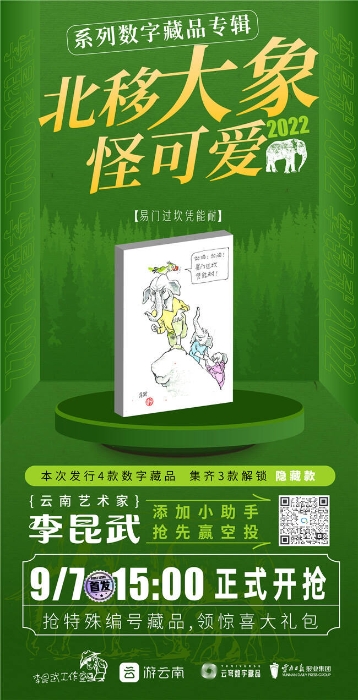 9月7日下午3点,《云南十九怪·北移大象怪可爱》数字藏品专辑将在“游云南”上线发售。4款数字藏品将以生动诙谐的方式,解锁本土漫画家李昆武笔下云南野生亚洲象“短鼻家族”北上南归的故事。