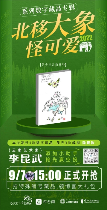 《云南十九怪·北移大象怪可爱》由李昆武执笔,云南日报报业集团、李昆武工作室和“游云南”数藏品牌“云穹”共同推出,是李昆武工作室的首个数字藏品。该数字藏品专辑包括《哈哈,老少出走雨林外!》《OK,喜生宝宝一路带!》《加油!易门过坎凭能耐!”》《爽!直奔翠湖冲凉快》等4款藏品,以幽默诙谐的方式描绘亚洲象“短鼻家族”的北上南归之旅,重温人与大象和谐共处的动人场景。