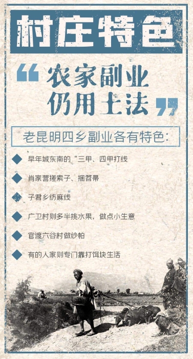 当时昆明四乡副业各有特色。有老人回忆说:早年城东南的“三甲、四甲打线,肖家营搓索子、捆笤帚,子君乡纺麻线。有的送到小板桥街上卖,有的送到昆明。广卫村则多半挑水果,做点小生意。官渡六谷村做纱帕,也有一两家以此为主业。酒房也多,有的人家则专门靠打饵块生活,有的已经做了几代人”(《昆明市志长编》)。