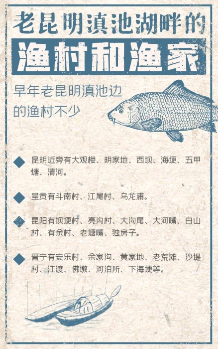早年滇池边的渔村不少。昆明近旁有大观楼、明家地、西坝、海埂、五甲塘、清河;呈贡有斗南村、江尾村、乌龙浦;昆阳有坝埂村、亮沟村、大沟尾、大河嘴、白山村、有余村、老塘嘴、独房子;晋宁有安乐村、余家沟、黄家地、老荒滩、沙堤村、江渡、佛墩、河泊所、下海埂等。到20世纪中期,滇池周边约有渔民两千多人,昆明附近有五百多人,一百人户。其中绝大多数是半农半渔,专门从事渔业的很少,因为渔业收入低,不足以解决一家的生活问题。民国《续云南通志长编》称:“滇池渔民之生活,因受农村经济破产之巨潮,日陷崩溃,故极宜设法挽救也。”坦言当时“渔民生活,受种种压迫,痛苦异常”,而“应如何改善渔民生活,废除苛税杂捐,普及水产知识”,都亟须解决。
