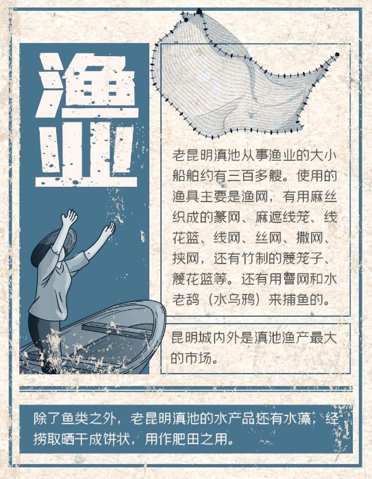 旧时在滇池从事渔业的大小船舶约有三百多艘。使用的渔具主要是渔网,有用麻丝织成的篆网、麻遮线笼、线花篮、线网、丝网、撒网、挟网,还有竹制的篾笼子、篾花篮等。此外还有用罾网和水老鸹(水乌鸦)来捕鱼的。昆明城内外是滇池渔产最大的市场,其次是沿湖各县的县城。