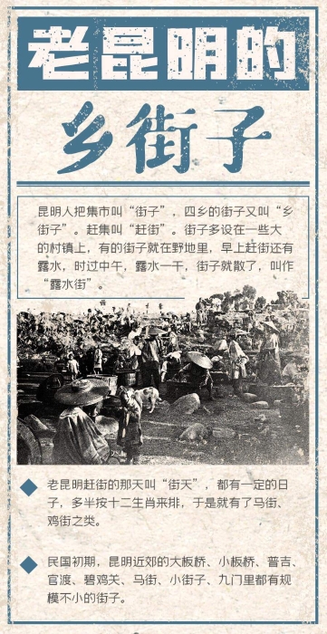 昆明人把集市叫“街子”,四乡的街子又叫“乡街子”。赶集叫“赶街”。街子多设在一些大的村镇上,有的街子就在野地里,早上赶街还有露水,时过中午,露水一干,街子就散了,叫作“露水街”。赶街的那天叫“街天”,都有一定的日子,多半按十二生肖来排,于是就有了马街、鸡街之类。民国初期,昆明近郊的大板桥、小板桥、普吉、官渡、碧鸡关、马街、小街子、九门里都形成规模不小的街子。街天时,附近乡村、城里甚至远近百里的人都会来赶街,交易兴隆,十分热闹。赶街多要赶早,因之有人做事性急,旁边的人会说:“又不是赶小板桥,急些哪样!”