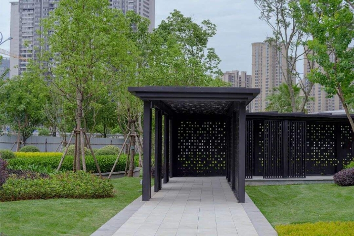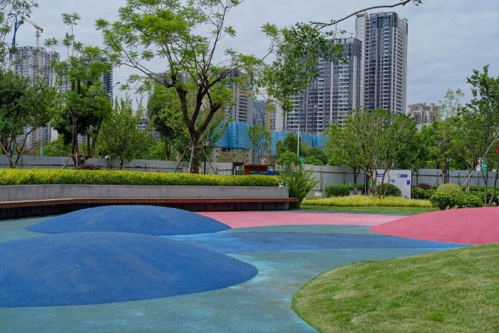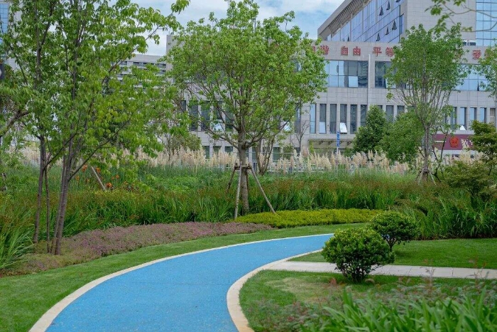 通过植物搭配以及透水铺砖、透水步道、雨水花园等海绵城市设施建设,突出园区的景观效果、文化特色,满足不同人群的使用需求。