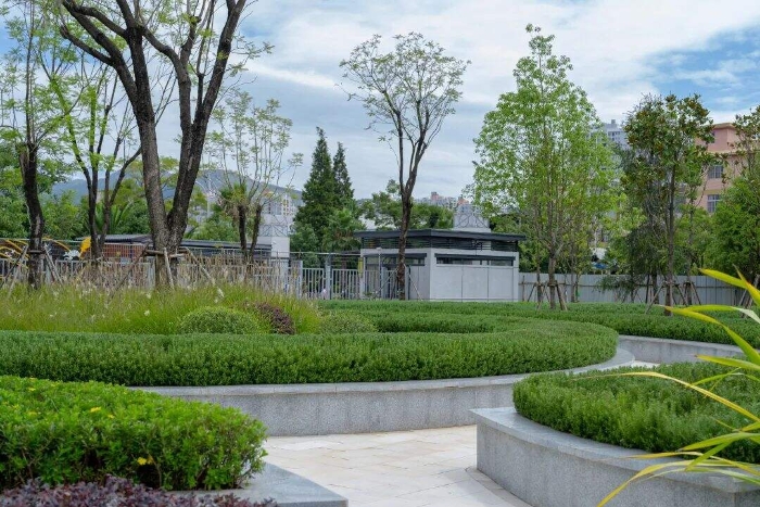 园内主要采用蓝花楹、黄连木、香樟、滇润楠、球花石楠、红枫、头状四照花等乡土树种,通过红花檵木球、金森女贞球、金姬小蜡球等组团灌木以及迷迭香、攀爬月季等特色植物,共计约50多个植物品种进行栽植,以顺势而为的设计、与时俱进的改造,努力营造最美街心花园。
