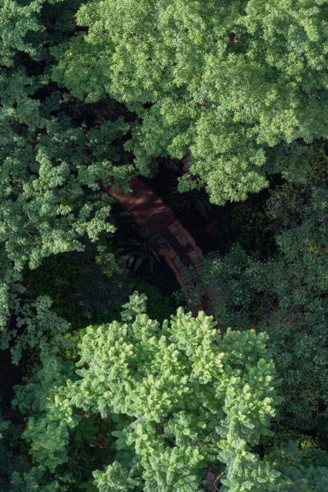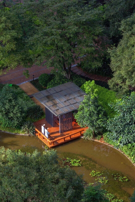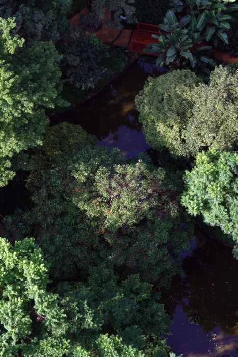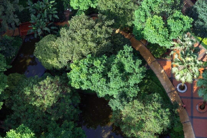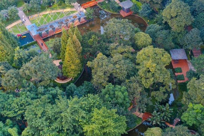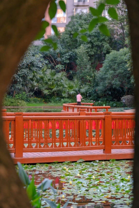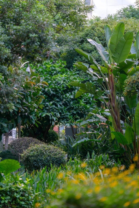 数百种灌木类、竹类、藤本类植物,共同营造出层峦叠翠的视觉效果,使人如入森林深处;4万平方米的中央水景景观,睡莲盛开,锦鲤游弋,为醉人的绿色又添了几分灵动。