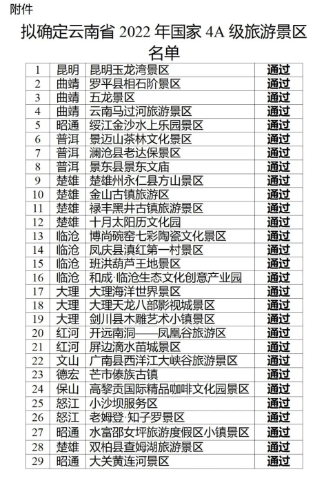 根据《旅游景区质量等级的划分与评定》(GB/T 17775-2003)国家标准和《旅游景区质量等级管理办法》要求,经各州(市)文化和旅游局初评、推荐,省文化和旅游厅按程序认真组织开展了2022年国家4A级旅游景区评定工作,昆明玉龙湾景区等29家景区达到国家4A级旅游景区的标准,拟确定为云南省2022年国家4A级旅游景区。